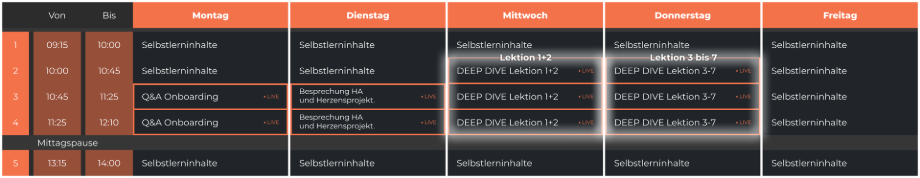 Die Kursinhalte stehen Ihnen flexibel zur Verfügung, sodass Sie diese in Ihrem eigenen Tempo und nach Ihrem individuellen Zeitplan bearbeiten können. Bitte beachten Sie jedoch, dass die Live-Sessions zu festgelegten Terminen stattfinden und eine Teilnahme daher nur zu diesen konkreten Zeiten möglich ist
