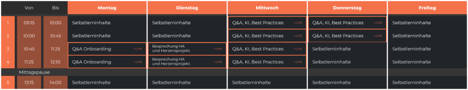 Montags, donnerstags und freitags widmen sich Teilnehmende selbstständig den Lerninhalten. Der Tutor begleitet Teilnehmer dabei und hilft bei Herausforderungen. Für den Lernerfolg spielen persönliche Disziplin und eigenständiges Arbeiten eine zentrale Rolle.